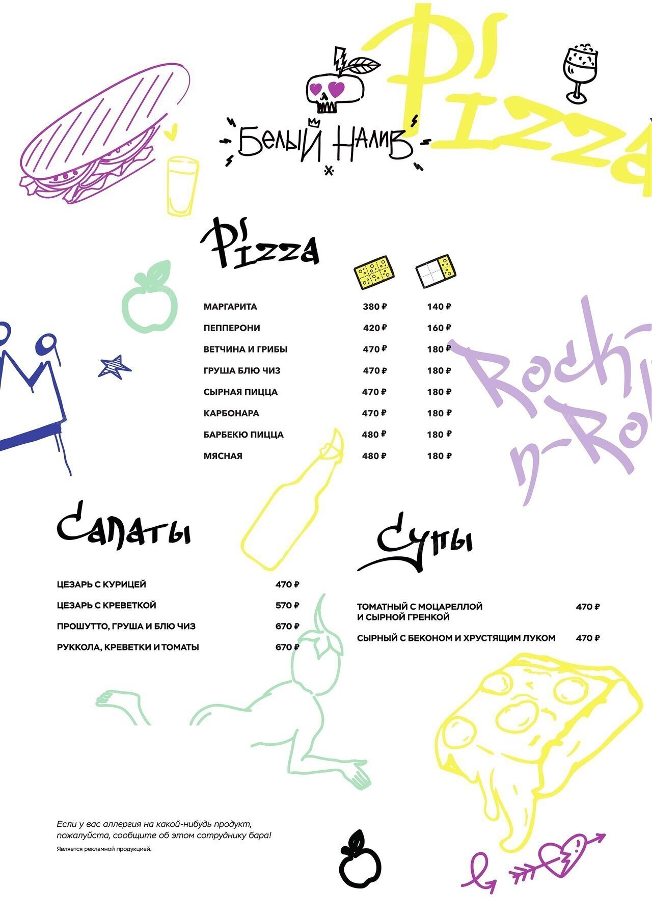 Основу барной карты составляют различные сорта сидра, включая эксклюзивные варианты. В заведении представлены как российские, так и зарубежные марки этого напитка.